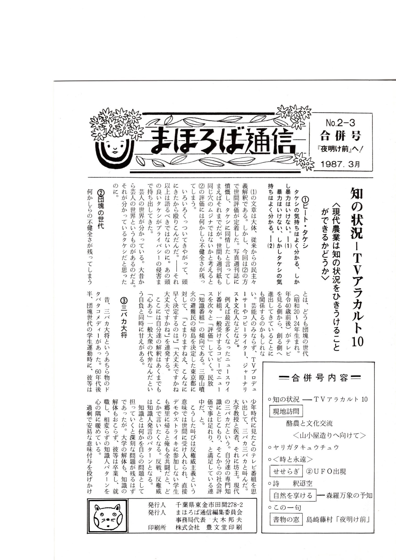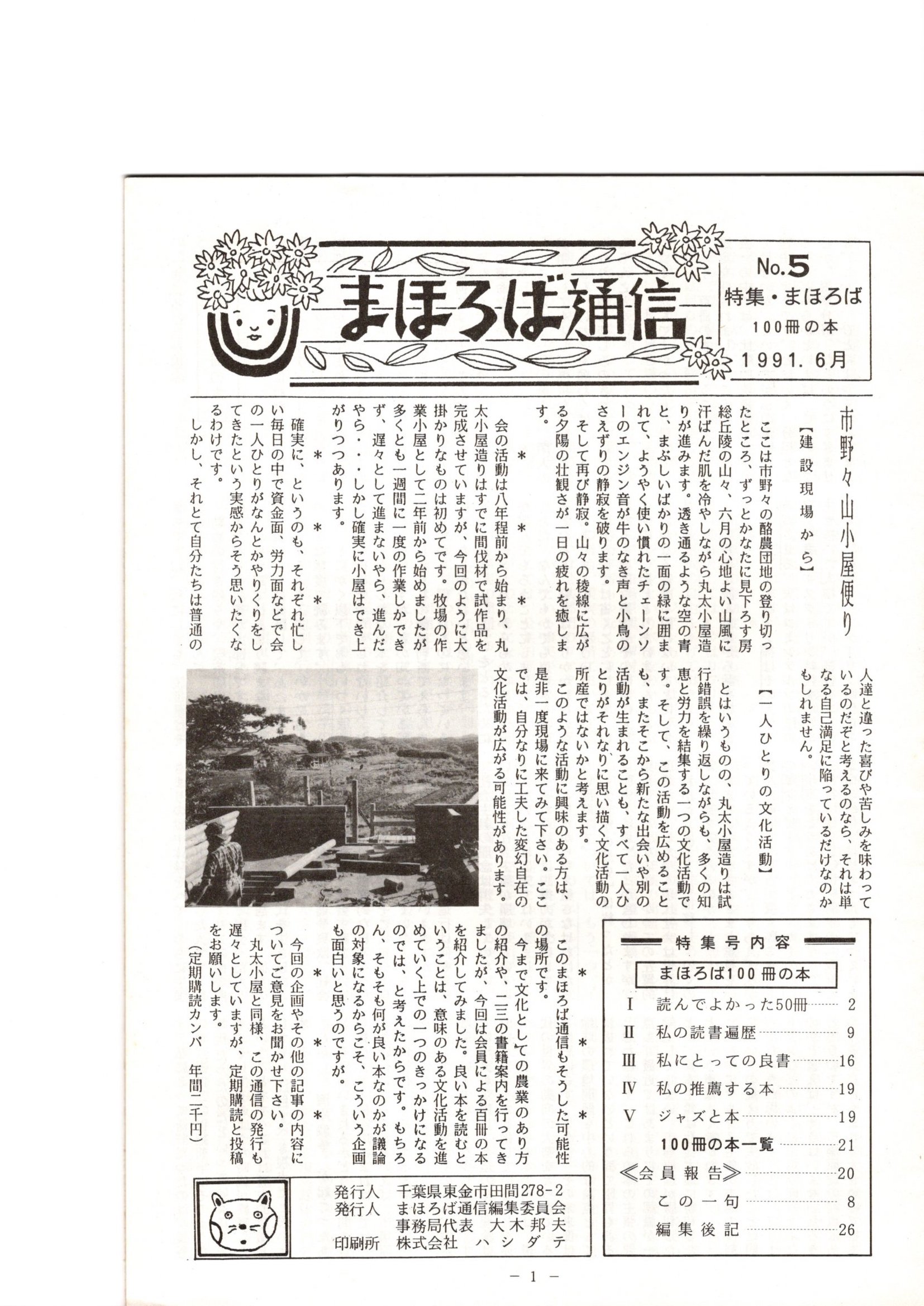 そして県内酪農団地の組合長と知り合うことになり、団地内に大きなログハウスを作ることになりました。まほろば会と名付けて十数人の有志が集まり、休日を利用して五年ほどかけて完成したのが「タラの芽庵」という大きなログハウスでしたでした。そこで陸稲やお茶など畑作をも行うとともに、私は『まほろば通信』というミニコミ誌を発行しました。