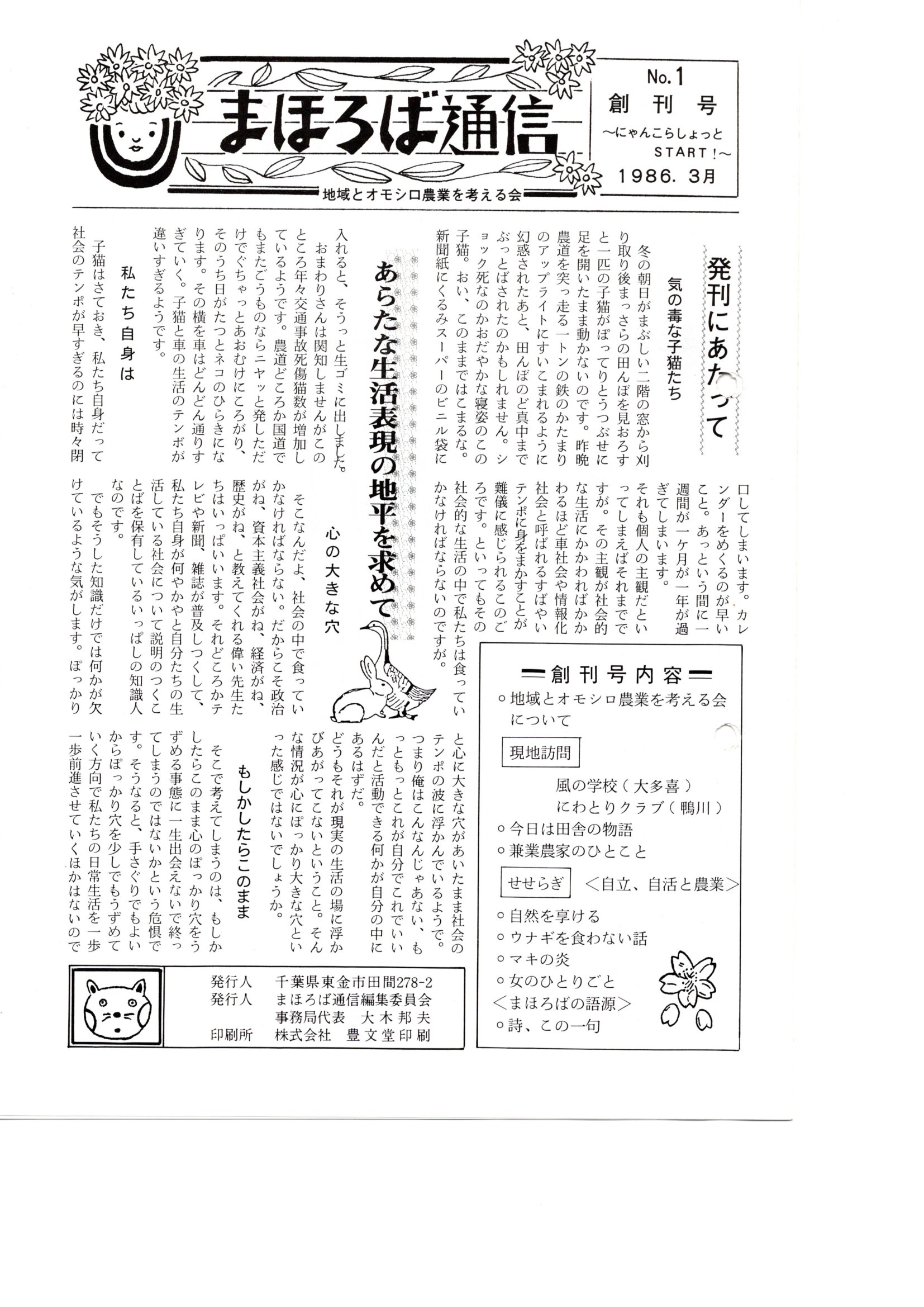 創刊号では、おもしろ農業の現地訪問記として、「風の学校」の中田正一さんを訪ねました。単身アフリカの農村飢餓地帯を訪れて民間ボランティアの難しさを痛感され、風車を利用した揚水ポンプの研究に専念されていました。またすでに亡くなりましたが、「大地の会」の藤本敏夫さんを南房総に訪ねて、山の中腹に広がる平飼養鶏や野菜畑、水田の複合経営の「自然王国」を、山中をスバルの四駆で案内してもらいました。